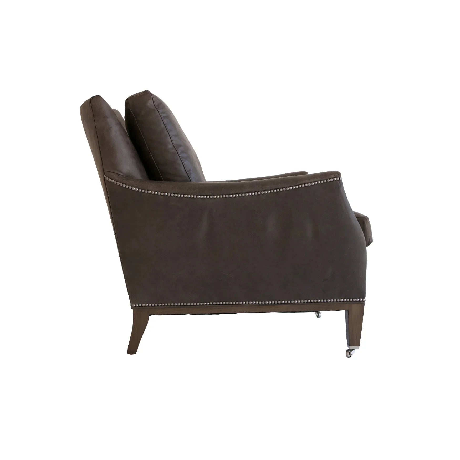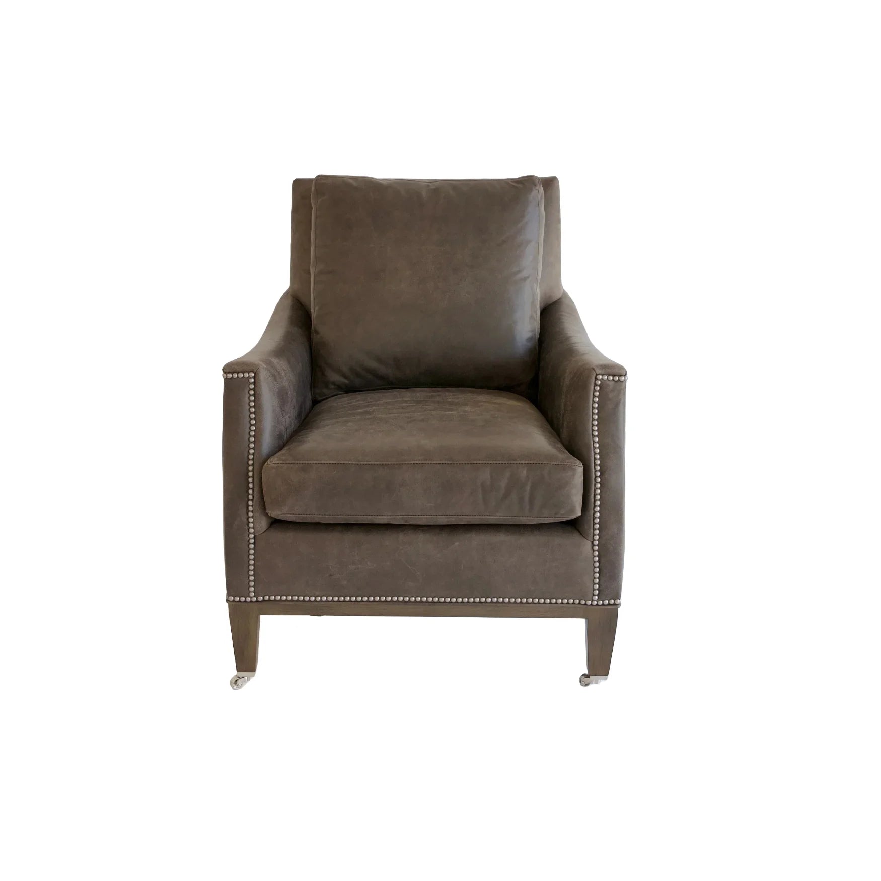 Upholstered in rich leather with tailored nailhead detailing, the Clark Chair blends classic craftsmanship with a refined silhouette. The supportive seat and gently curved arms offer both comfort and polish.