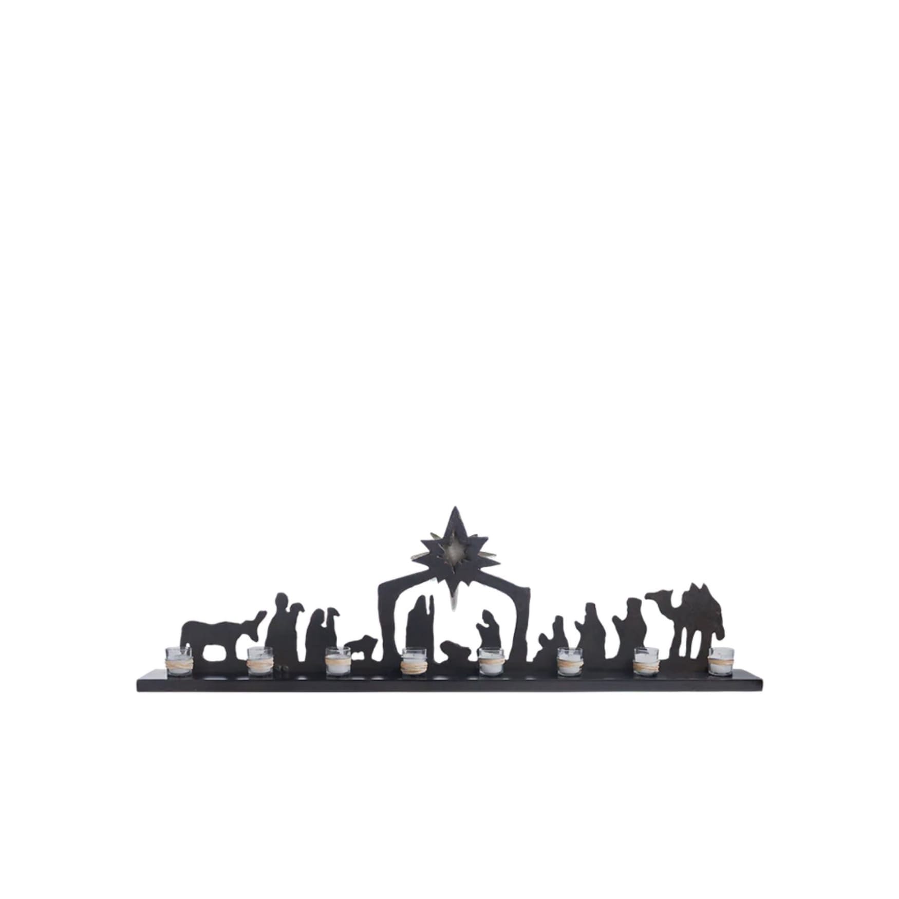 Navity scene tribute. Extra-large iron nativity rail with polished iron star on a removable wood base, set with 8 mini Barboglio Adelitas (52" x 5" x 15"H). A beautiful tribute to the season.FedEx (Ground) Delivery