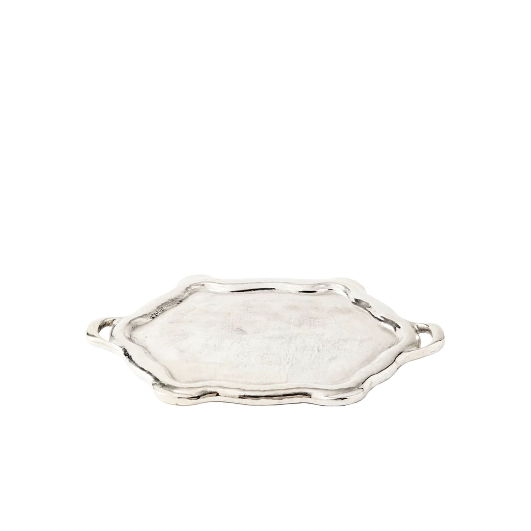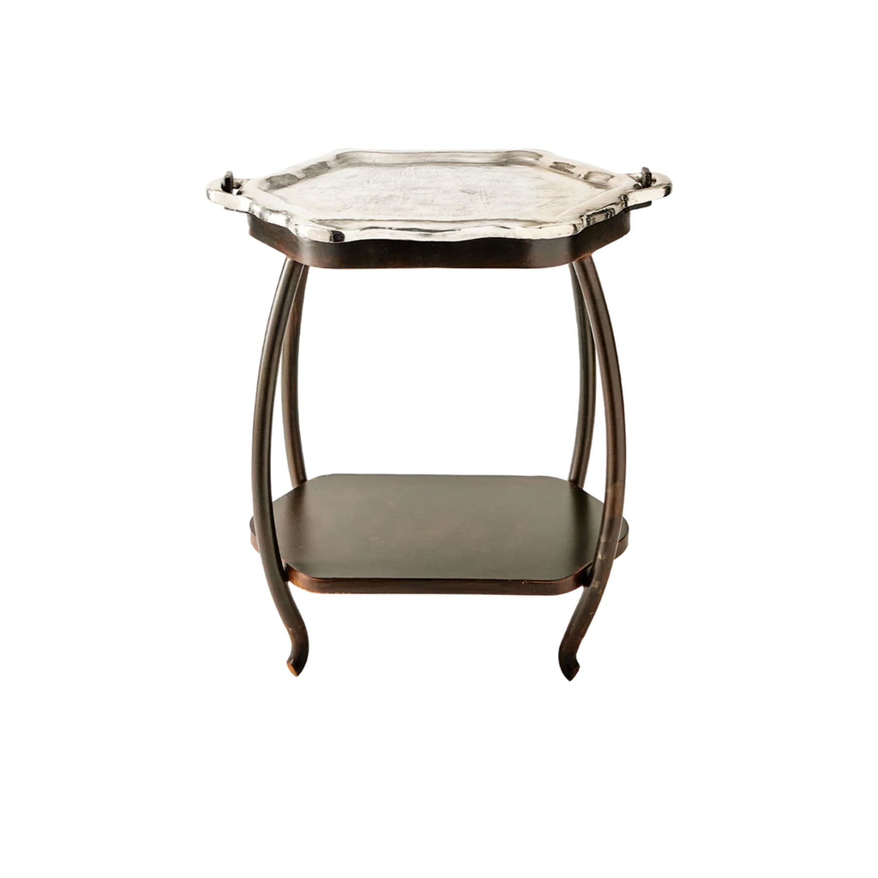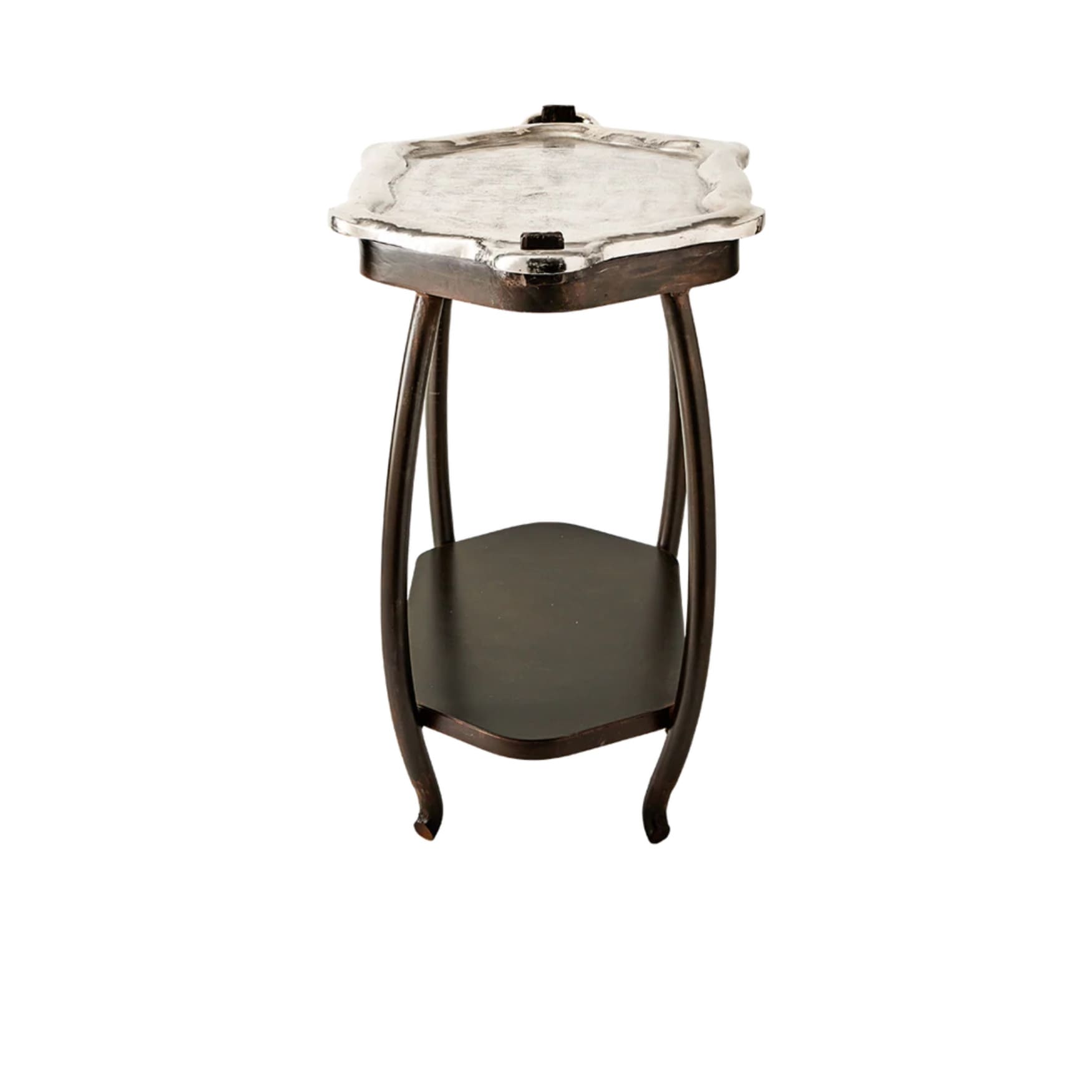 Elegance for every gathering. Nickel-plated cast iron removable tray resting on an iron table base with gracefully curved legs in a natural finish (32 x 21 x 33). Perfect for a bar area, living room, or entertaining space.