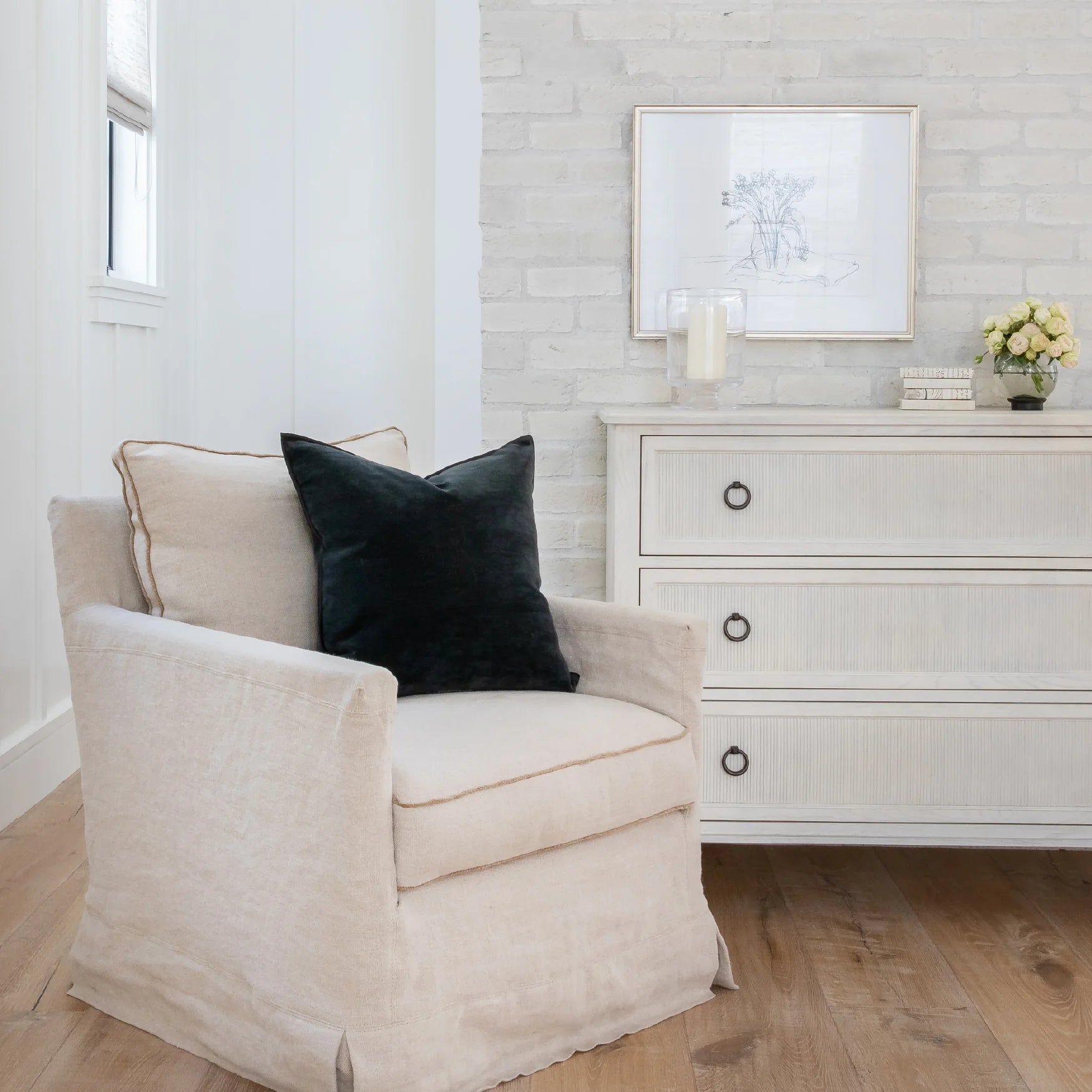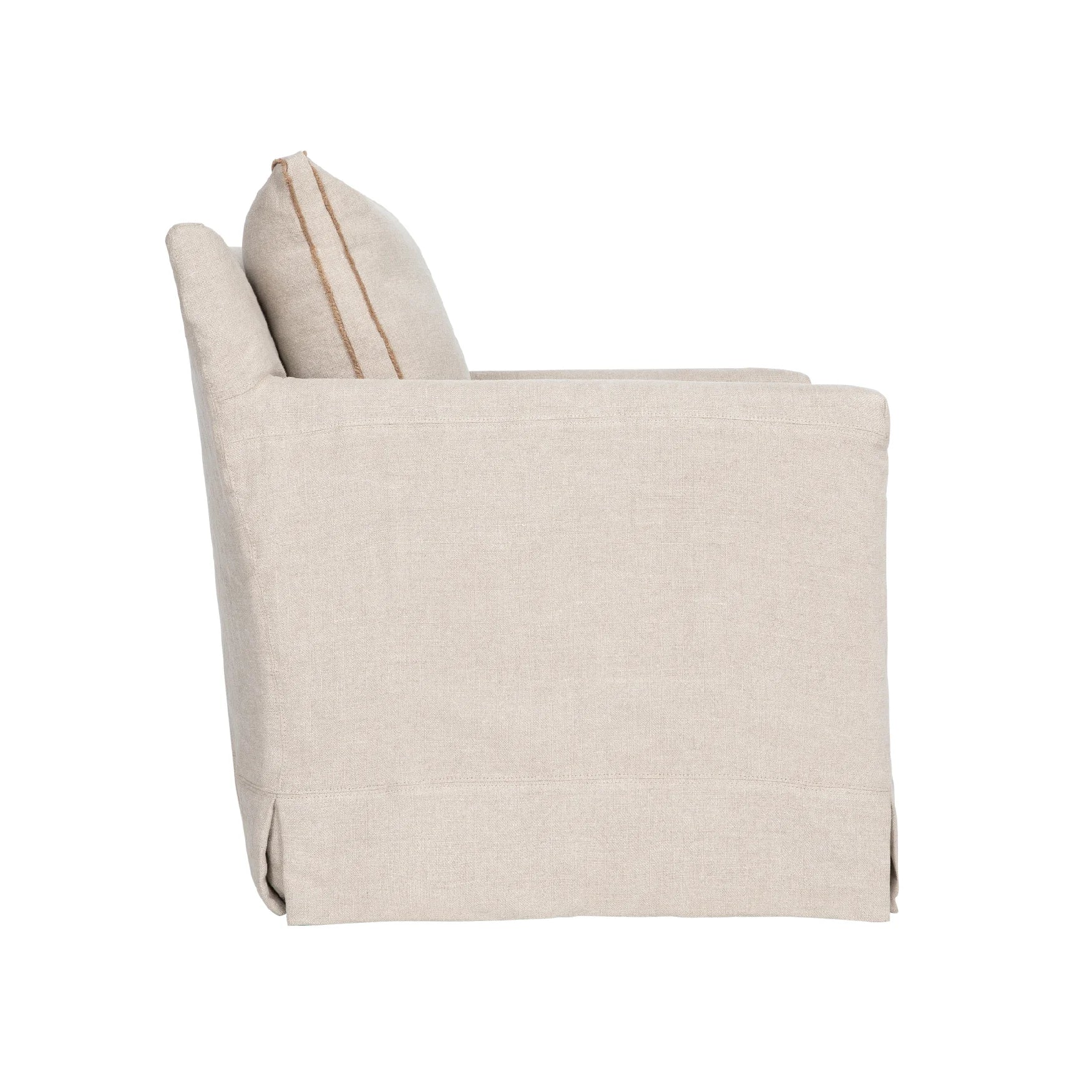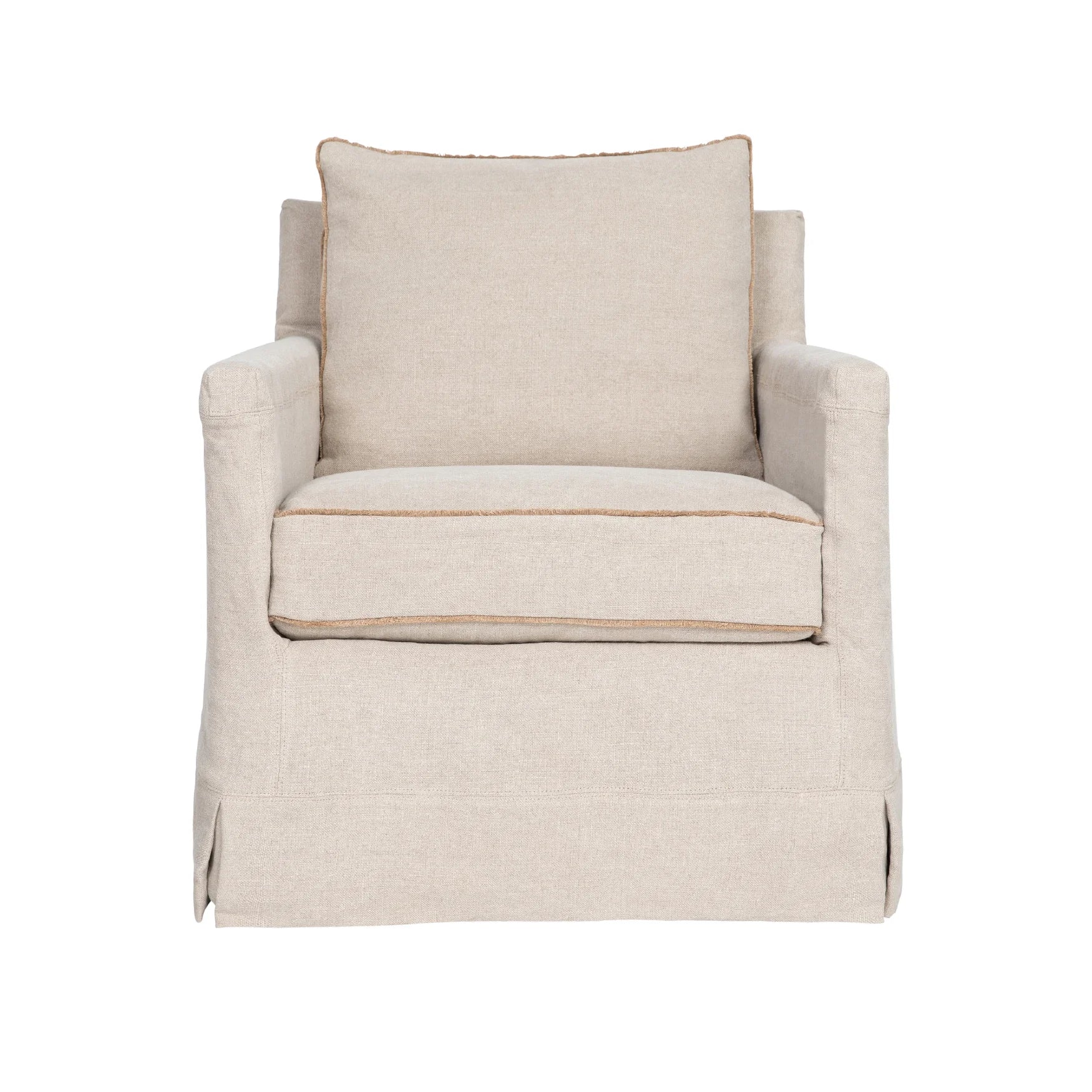 Simplicity and practicality at its finest. The clean lines and low profile of the Peyton Slipcovered Chair make a quiet statement and let the cool, eye catching trim do all the talking. A complete 360 degree swivel allows you to comfortably position yourself for your best possible viewing.
