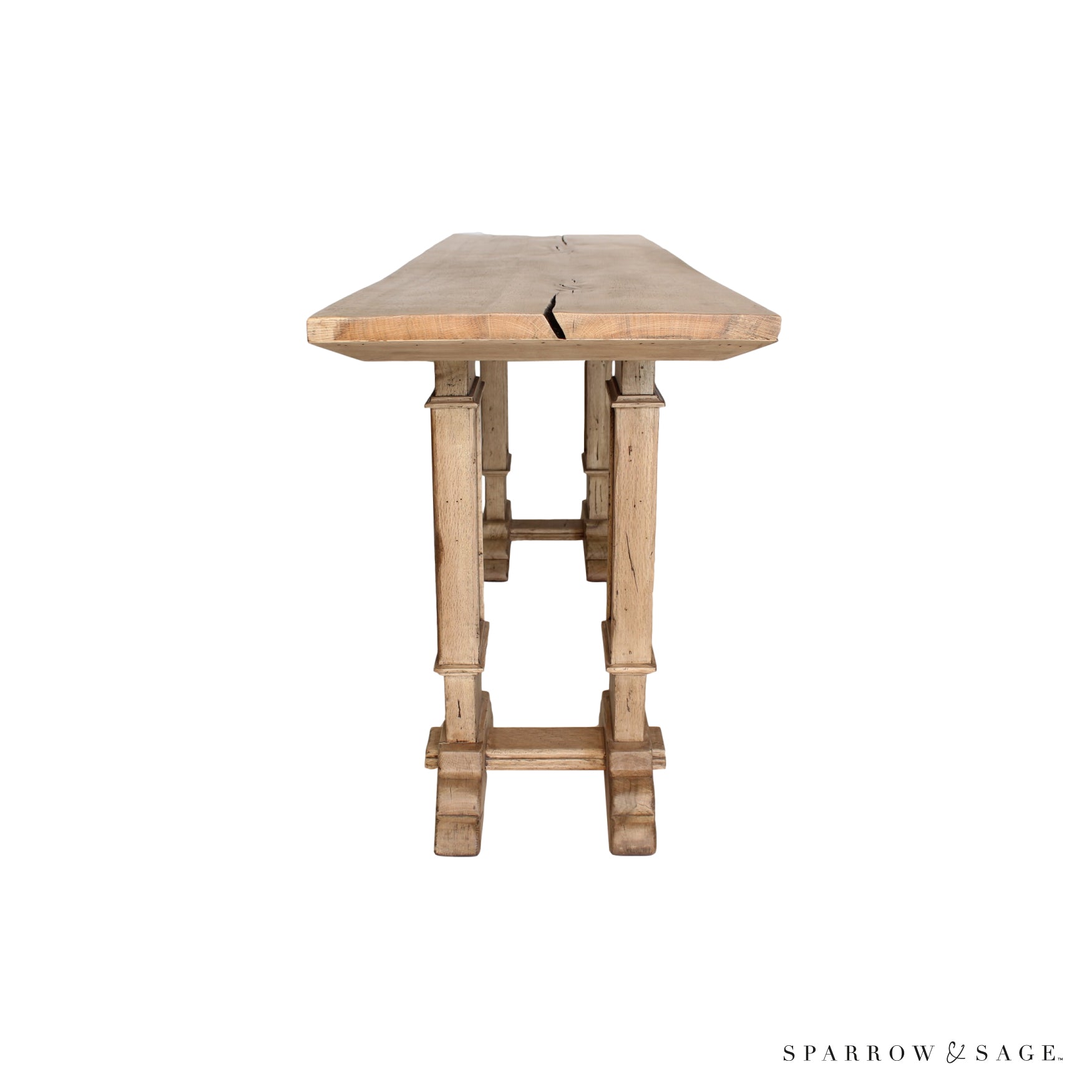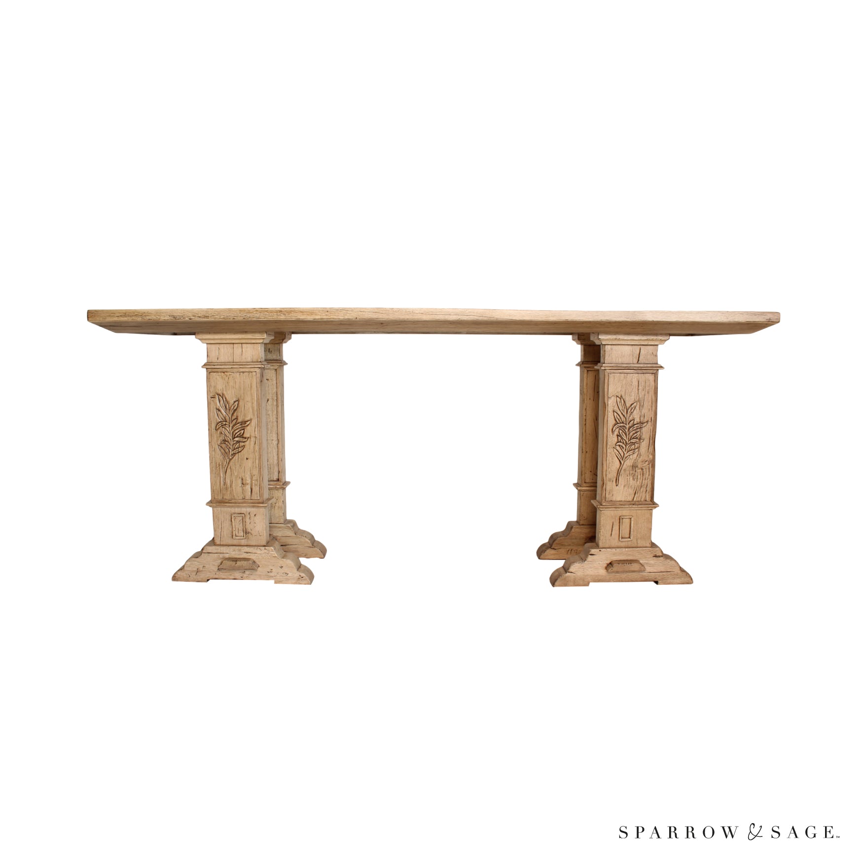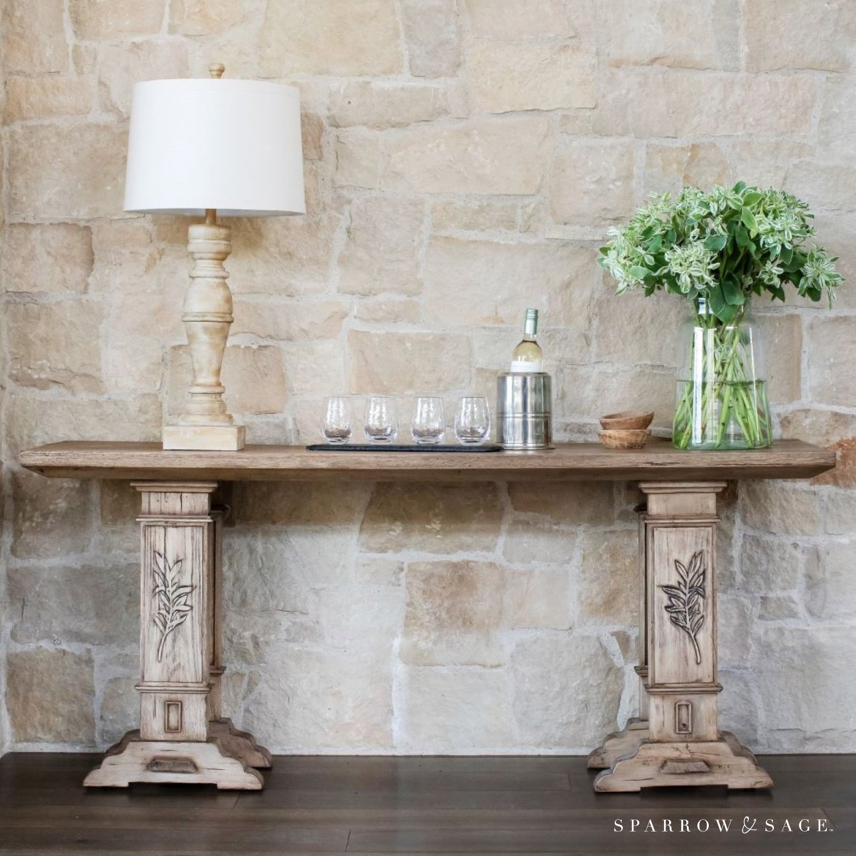 The Sorrento Console is constructed of solid Monterrey Oak by master woodworkers. The beauty of the work is embodied in the hand carving of the laurel leaf and the gracefully curved edges of the leg base. This console's gorgeous design will elevate any space in your home.