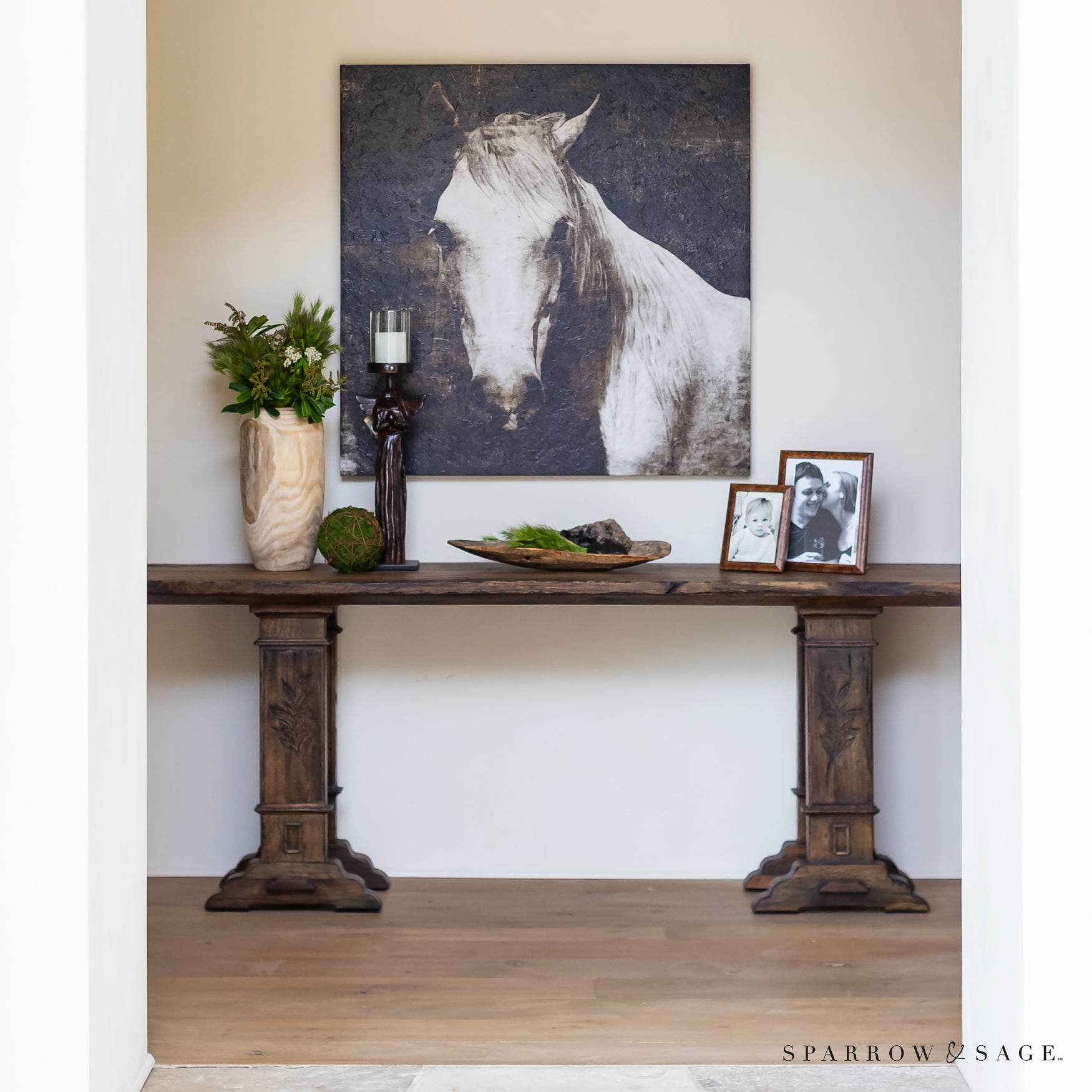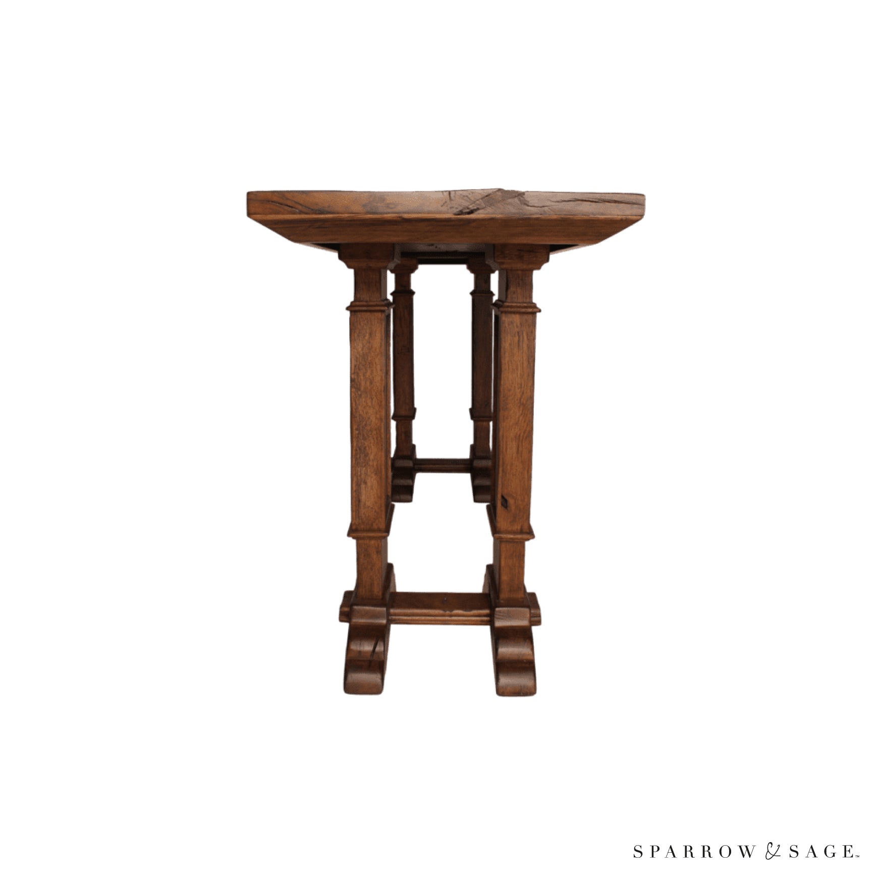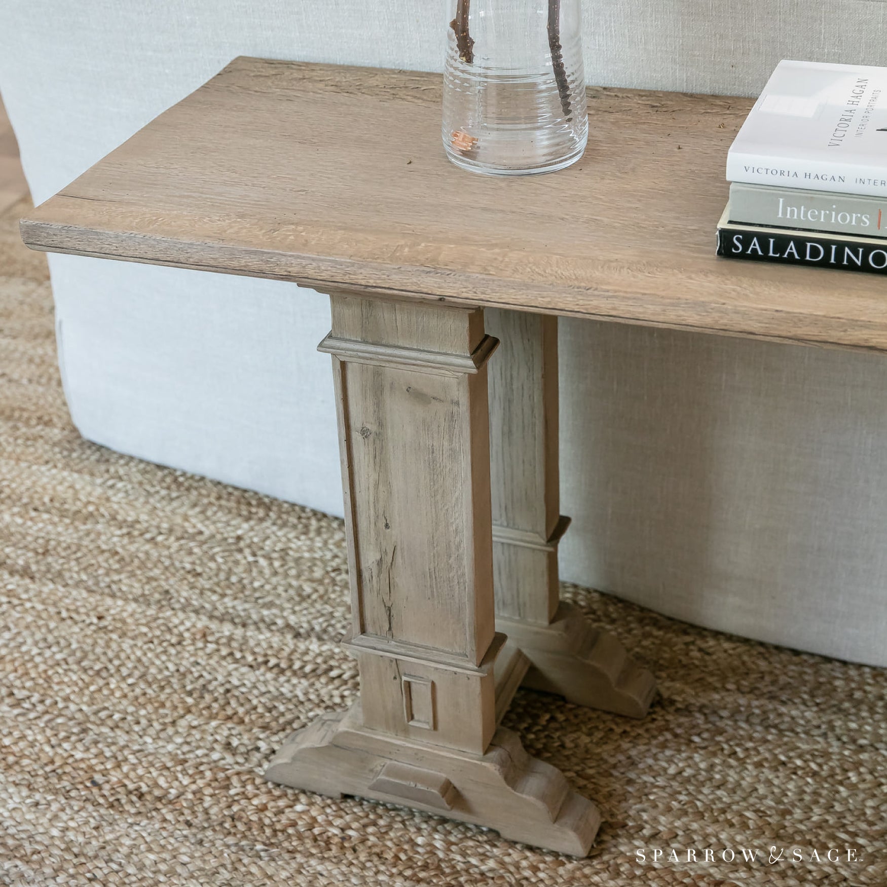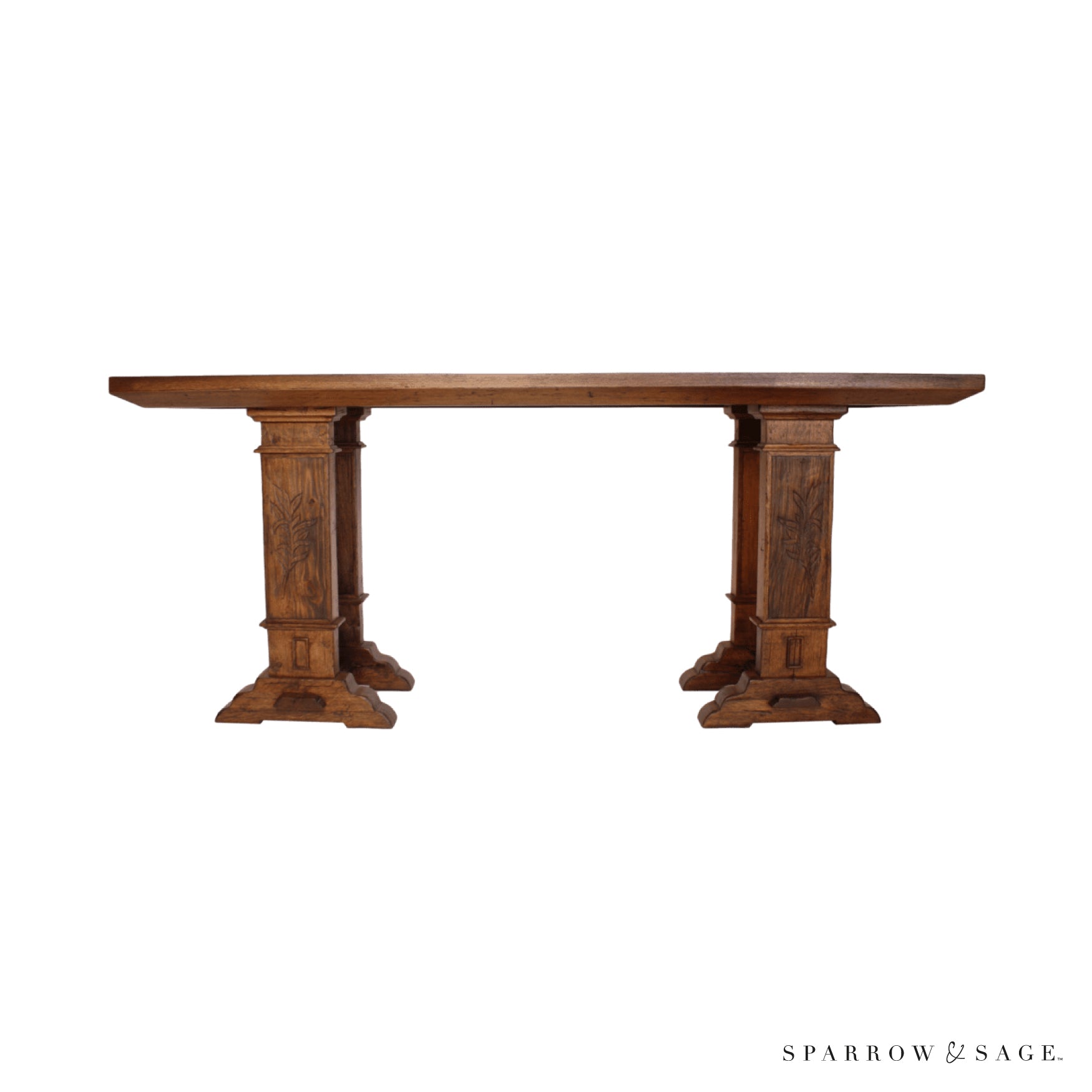 The Sorrento Console is constructed of solid Monterrey Oak by master woodworkers. The beauty of the work is embodied in the hand carving of the laurel leaf and the gracefully curved edges of the leg base. This console's gorgeous design will elevate any space in your home.
