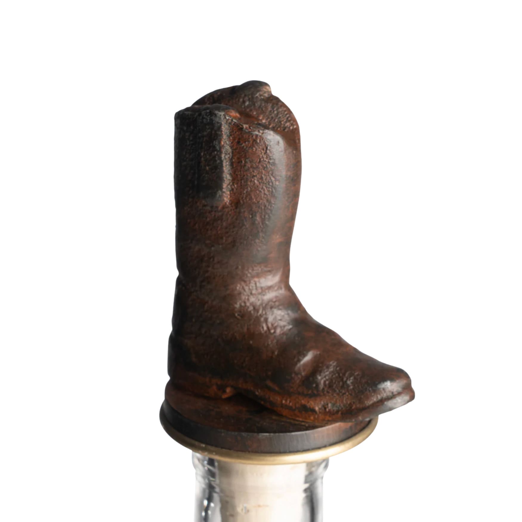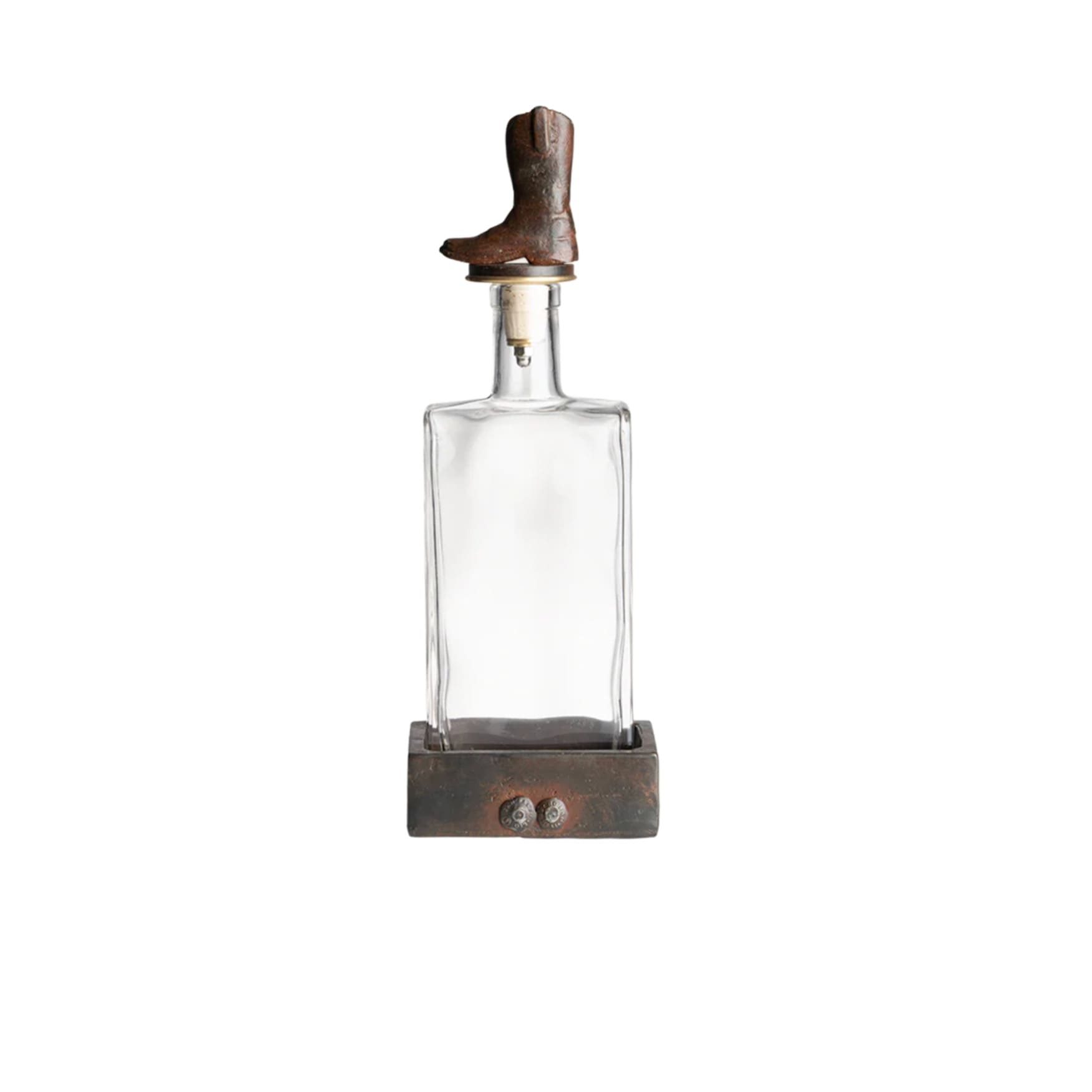 A Western tribute. Handcrafted glass decanter crowned with a wax-cast iron cowboy boot stopper and set upon a rustic iron base (5" x 3" x 14"H). A bold statement piece that brings rugged charm and artisanal craftsmanship to any bar or tabletop.FedEx (Ground) Delivery